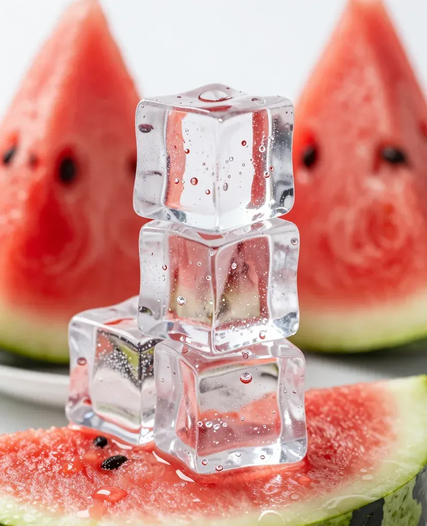 A close-up of stacked ice cubes with visible air bubbles, set against vibrant watermelon slices, illuminated by soft, diffused light that highlights the textures and colors of both subjects. The blurred background of watermelon slices adds depth and context to the scene.