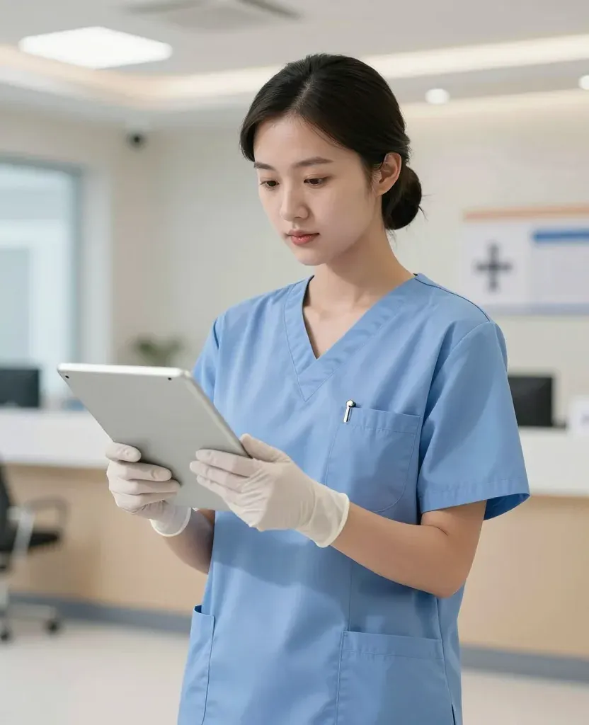 A nurse in blue scrubs and white gloves carefully reviews a tablet in a softly lit hospital reception area. The diffused lighting and slight depth of field emphasize the nurse and tablet, creating a professional and focused atmosphere.