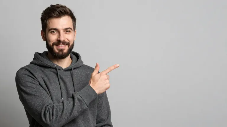 A bearded man in a heathered gray hoodie smiles warmly while pointing with his right hand toward the right side of the frame. Soft frontal studio lighting creates even illumination with subtle catchlights, and the shallow depth of field isolates the subject against a plain light gray background with ample copy space.