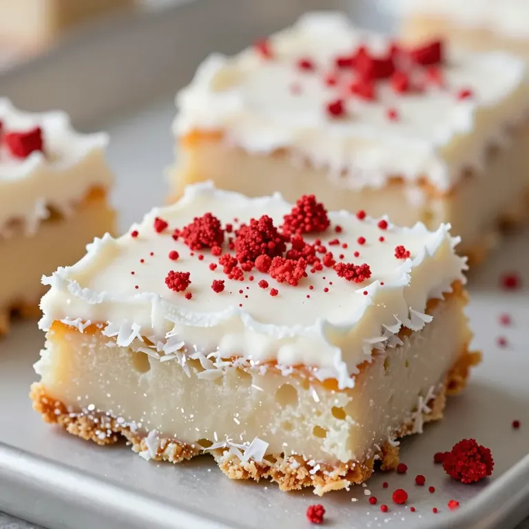 Close-up of coconut-frosted bars with red sprinkles, showcasing a smooth, creamy texture and a golden base under soft, diffused lighting. The shallow depth of field ensures the focus remains on the dessert, with a blurred neutral background.