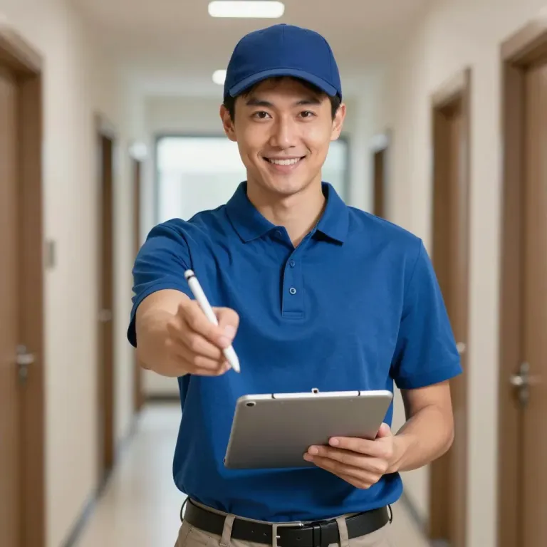A delivery person in a blue uniform holds a document and pen, with soft, even lighting creating subtle shadows and highlights. The neutral-toned hallway background is slightly out of focus, emphasizing the subject in the foreground.