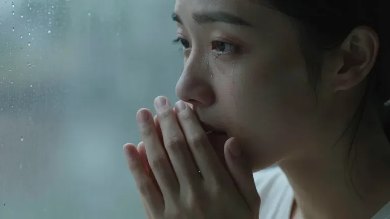 A woman stands by a window, tears streaming down her face, hands near her mouth, with soft, diffused light highlighting her and the raindrops on the glass. The shallow depth of field draws attention to her emotional expression, creating a poignant and intimate scene.