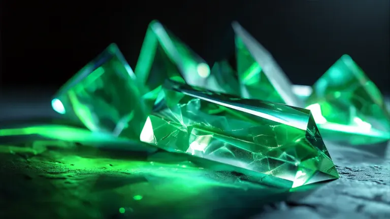 A close-up of a cluster of emerald-green crystals, backlit to create a radiant glow and highlight their faceted surfaces. The dark, out-of-focus background emphasizes the crystals as the main subject, with a shallow depth of field blurring the background.