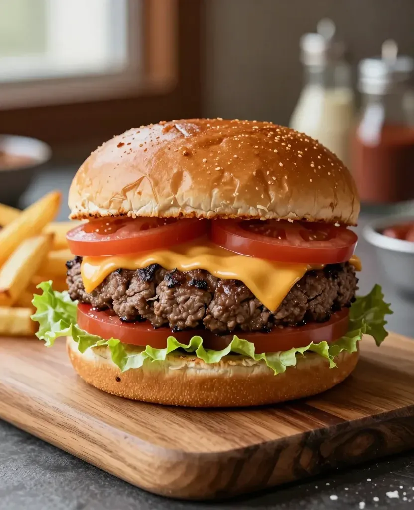 A juicy beef patty topped with gooey melted cheddar, crisp lettuce, and ripe tomato slices, nestled in a golden sesame seed bun on a rustic wooden board. Soft natural light from the left highlights the textures, while a shallow depth of field blurs the background condiments and fries, emphasizing the burger as the focal point.