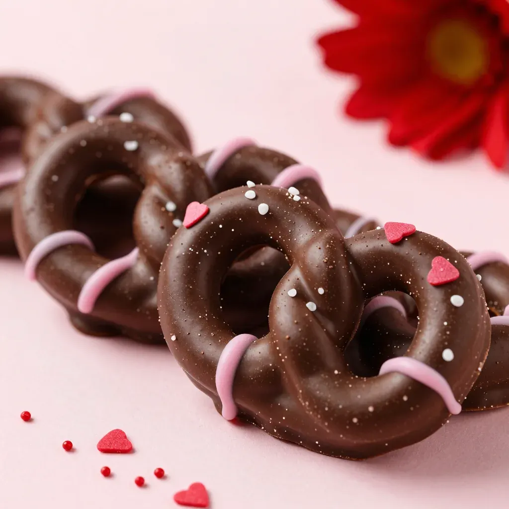 A chain of chocolate-covered pretzels adorned with pink drizzle, white sugar sprinkles, and tiny pink hearts, showcasing a glossy chocolate surface and textured pretzel base. Soft directional lighting from the upper left enhances the sheen, while a shallow depth of field and diagonal composition guide focus to the central pretzel against a pale pink background with a blurred red flower.