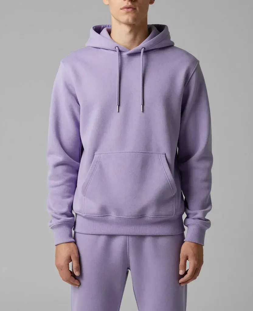 A person is wearing a soft, plush lavender hoodie and matching pants, illuminated by diffused light that creates gentle shadows and highlights. The neutral, light gray background ensures the focus remains on the subject, providing ample copy space for design use.