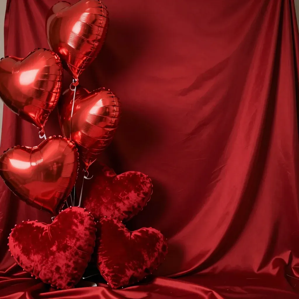 A cluster of heart-shaped balloons, metallic and plush, softly illuminated by diffused light, creating a three-dimensional effect against a smooth, draped crimson fabric backdrop. The composition highlights the balloons' vibrant textures and the rich, unobtrusive background complements their vibrant crimson hue.