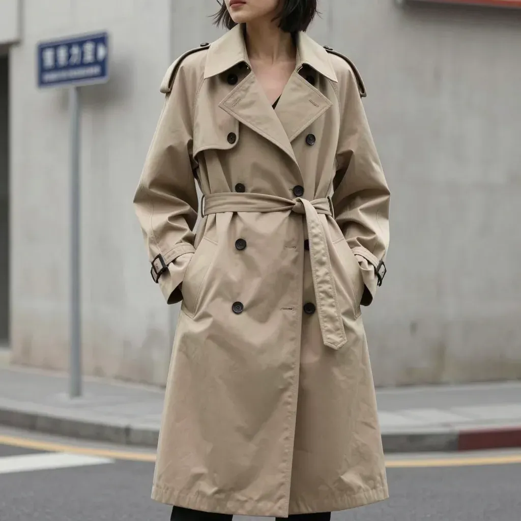 A person stands on a street corner in a beige trench coat, with soft, diffused light creating gentle shadows. The slightly blurred background emphasizes the subject, offering a clean and focused composition.