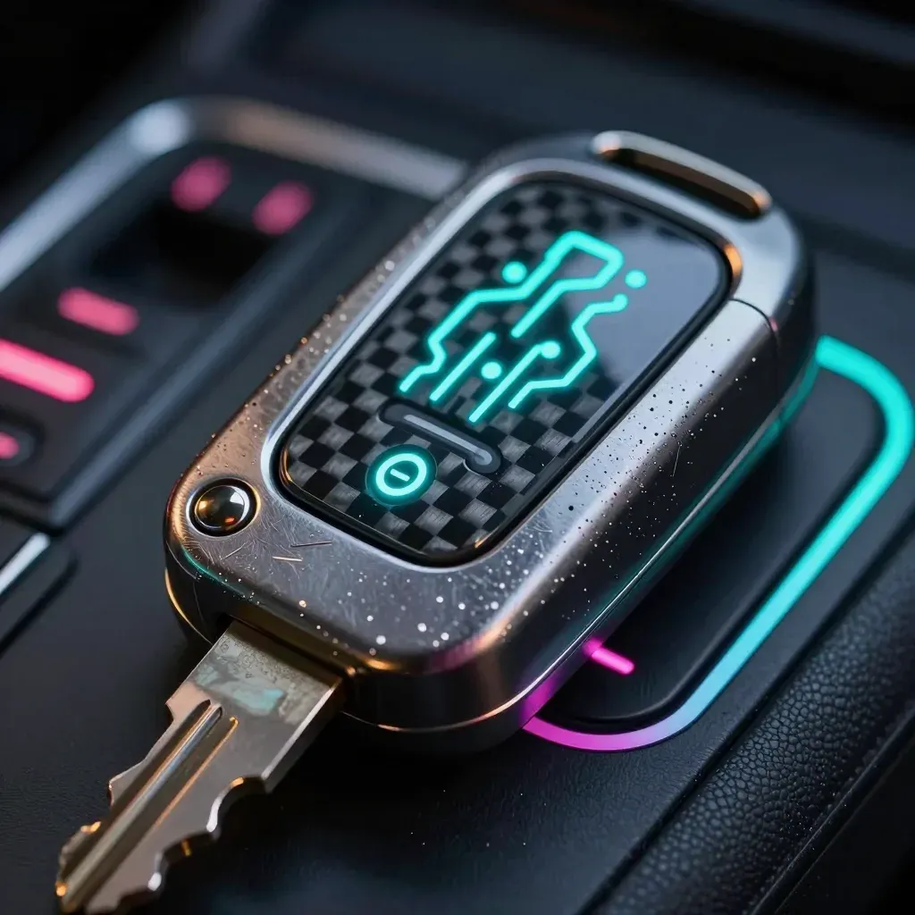 A glossy key with a digital display glows with teal and purple neon lights, set against a dark, textured dashboard. The shallow depth of field emphasizes the key, creating a sleek and modern aesthetic.