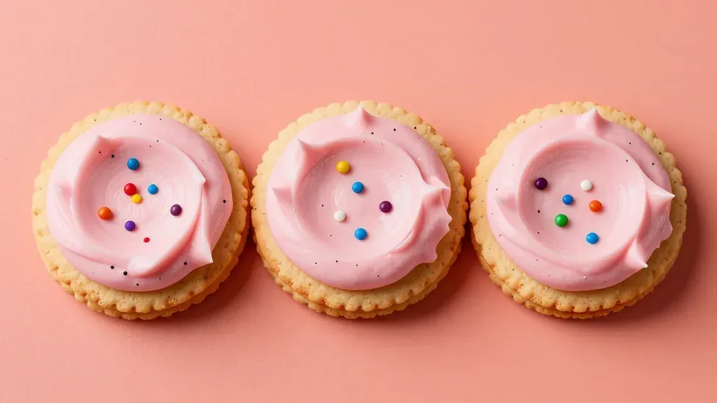 Cookies topped with glossy pink cream and vibrant multicolored candies, arranged linearly against a soft, diffused light backdrop. The clean, unobtrusive pink background enhances the visual appeal and provides ample copy space.