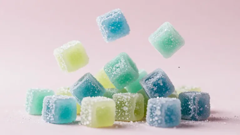 Translucent, glossy cool mint candies in shades of blue and green, suspended in mid-air with a rough sugar coating, illuminated by soft, diffused light from above, creating highlights and a gentle glow. The light pink background enhances the pastel tones and provides a clean, minimalistic backdrop.