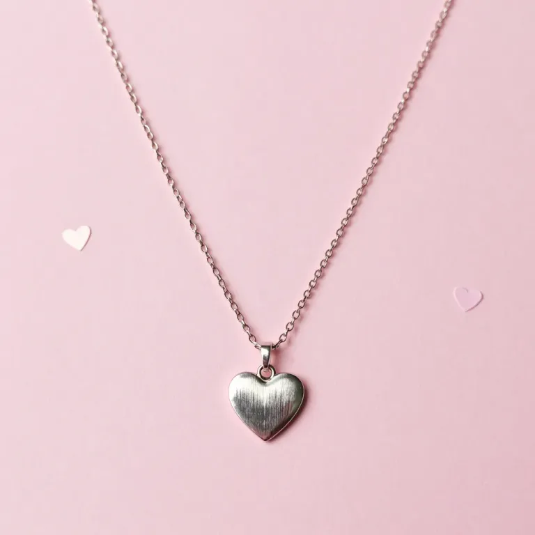 A smooth silver heart-shaped pendant necklace with an etched metal finish, softly illuminated against a clean, solid pink background. The minimalist composition and soft lighting create a serene and elegant visual appeal.