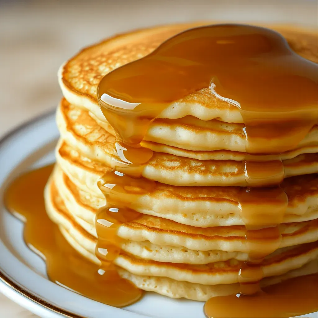 A close-up of fluffy golden pancakes drizzled with thick, glossy caramel sauce, illuminated by warm ambient light that highlights the glossy texture and golden hue. The shallow depth of field and blurred background emphasize the pancakes and caramel, making it perfect for culinary and breakfast-themed content.