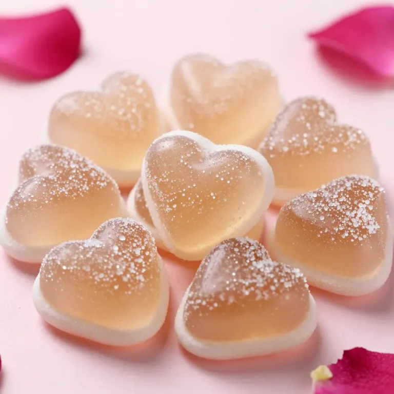 Translucent yellow heart-shaped jelly candies with powdered sugar, softly lit from above, creating a warm and romantic glow. The blurred pink petals in the background add a natural and elegant touch to the composition.