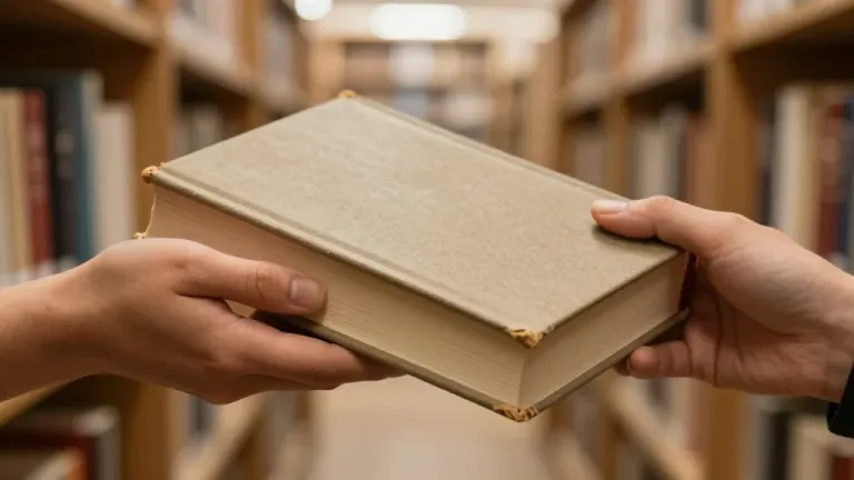 Hands carefully exchange a leather-bound book with slightly yellowed pages, set against a softly lit, bookshelf-filled library. The warm beige of the bookshelf and the cool blue of the background create a balanced and inviting atmosphere.