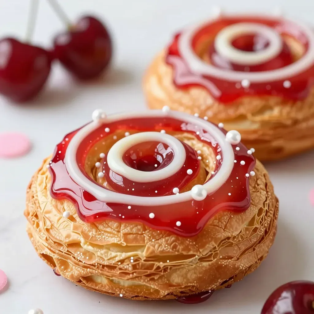 Glossy cherry glaze and smooth white icing adorn flaky pastry danishes, highlighted by bright, direct lighting that accentuates their vibrant red and golden hues. The shallow depth of field isolates the danishes, emphasizing their texture and color against a blurred background of cherries and decorative elements.