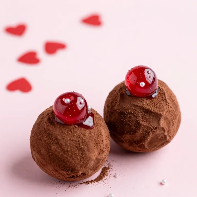 Two cocoa-dusted chocolate truffles crowned with vibrant, glossy red cherries rest on a soft pink surface, with scattered heart cutouts and sugar crystals adding festive detail. Soft diffused lighting creates gentle highlights on the cherries and a shallow depth of field isolates the truffles against a clean, minimalist background with ample copy space.