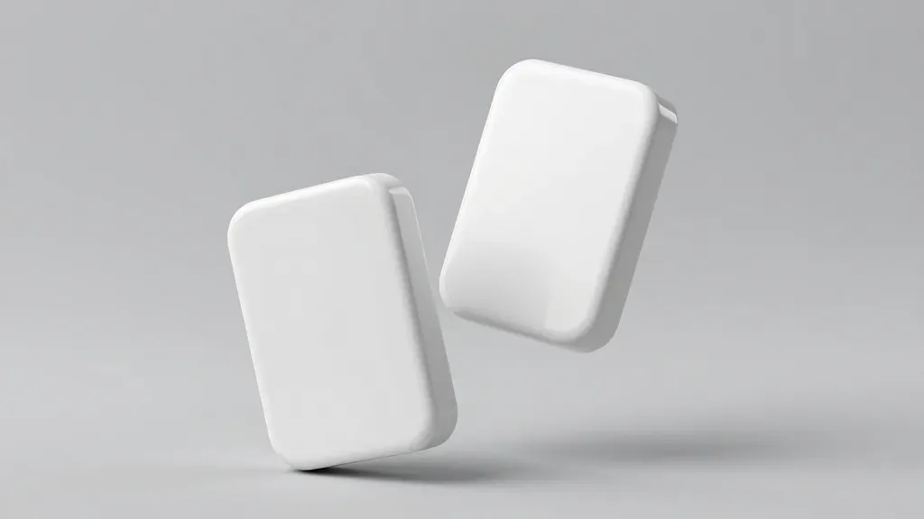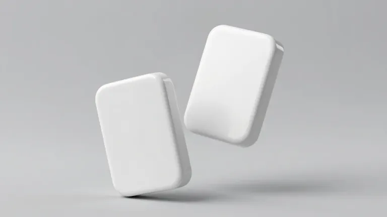 Two glossy white dominoes tilt symmetrically against a minimalist gray background, creating a dynamic and balanced composition with soft diffused lighting from above. The neutral backdrop provides ample copy space for design elements.