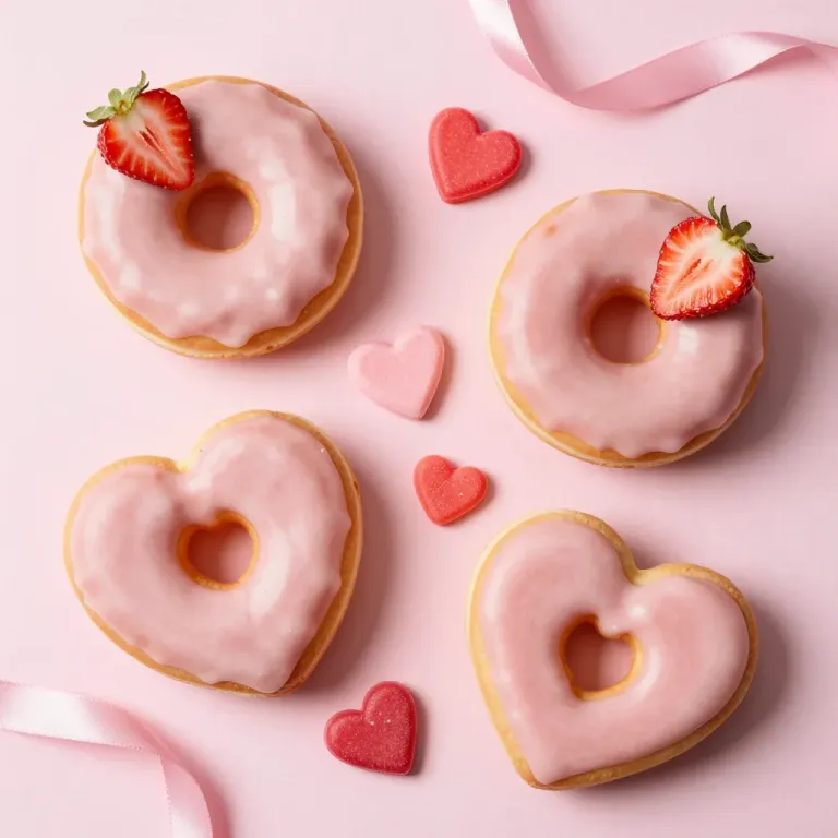 A symmetrical arrangement of pink-glazed donuts and heart-shaped cookies, adorned with fresh strawberries, under soft diffused lighting that highlights the glossy glaze and juicy strawberries. The clean, solid pink background emphasizes the subjects and creates a harmonious, visually appealing composition.