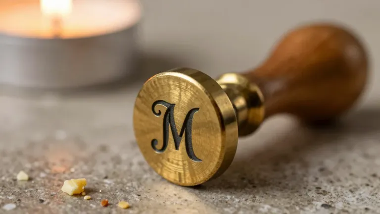 An antique brass signet stamp with a wooden handle, engraved with the letter 'M', rests on a textured stone surface with scattered wax crumbs, illuminated by warm candlelight. The shallow depth of field and soft directional lighting emphasize the brushed brass and polished wood, while the blurred candle in the background creates an intimate, focused composition.