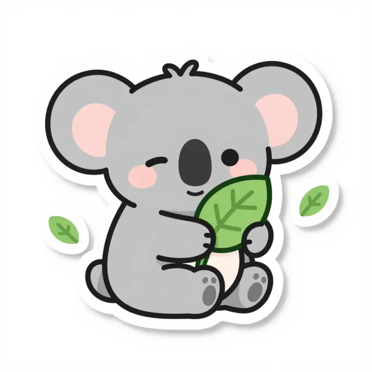 A soft, plush koala holds a vibrant green eucalyptus leaf, its features highlighted by a warm, diffused light. The shallow depth of field and neutral white background with scattered green leaves create a serene and focused composition.