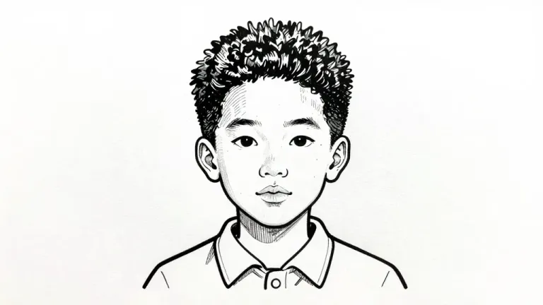 A young boy with a curly afro and collared shirt faces forward, rendered in graphite pencil with smooth skin and dense cross-hatching in the hair. Frontal soft lighting creates even illumination with gentle shadows, and the plain off-white background provides clean, distraction-free framing.