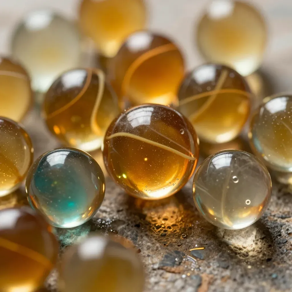 Amber-colored marbles with glossy surfaces reflect soft, diffused light, creating highlights and shadows. The close-up shot and shallow depth of field emphasize the marbles against a rough, textured background, providing a stark contrast.