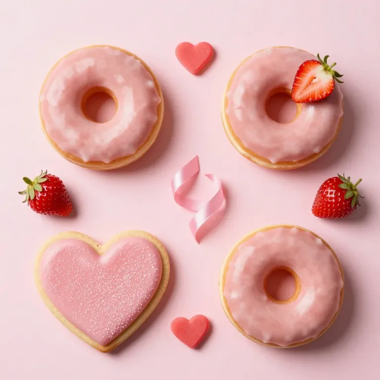 Soft pink donuts with glossy glaze and heart-shaped cookies with sprinkled sugar are arranged symmetrically against a solid pink background, highlighting their vibrant colors and glossy surfaces under diffused lighting.