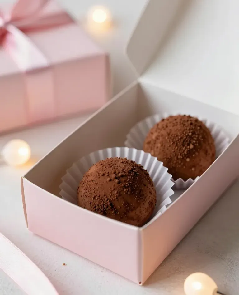 Smooth, glossy chocolate truffles with fine cocoa powder are presented in a white box, with soft, diffused lighting creating gentle shadows and highlights. The background, featuring a soft pink gift box with a pink ribbon and small twinkling lights, adds depth and context to the composition.