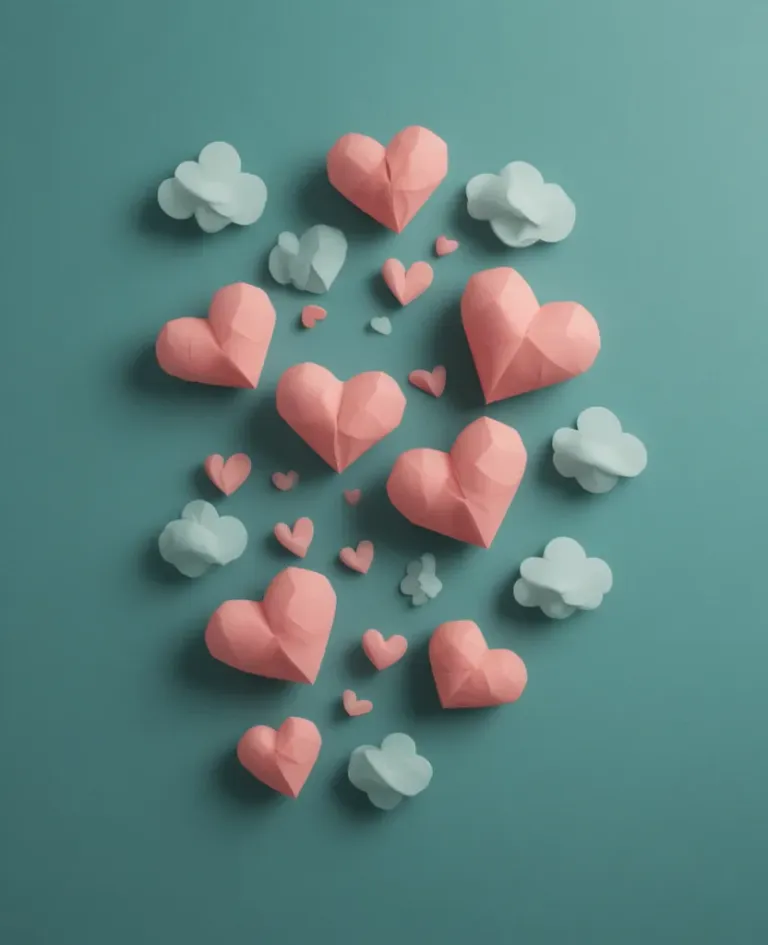 Glossy coral origami hearts with a three-dimensional sculptural quality are scattered in a loose, organic pattern on a solid teal background, creating a sense of movement and depth. Soft, diffused light highlights the creases and shadows of the hearts, emphasizing their texture and form.
