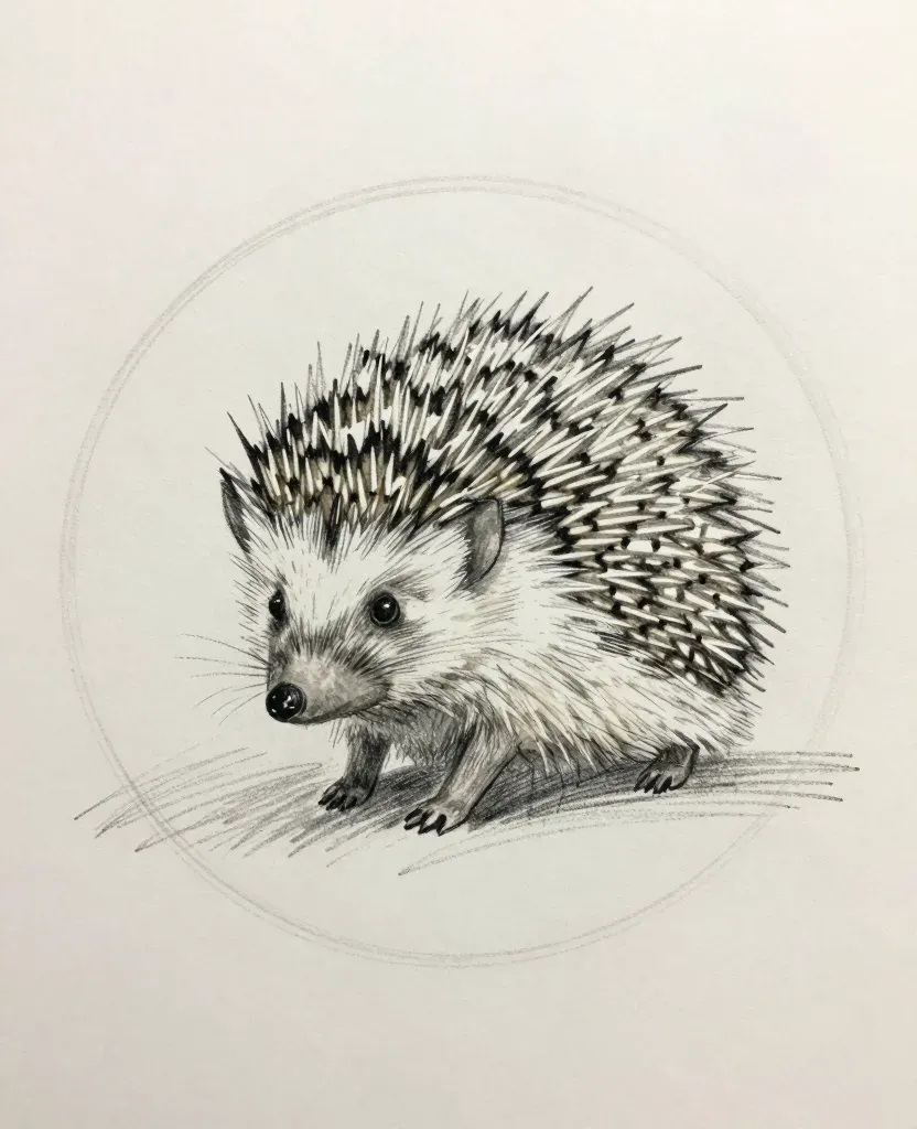 A detailed pencil drawing of a hedgehog curled up, showcasing its quills and features under soft, natural light. The minimal background ensures the hedgehog remains the focal point of the image.