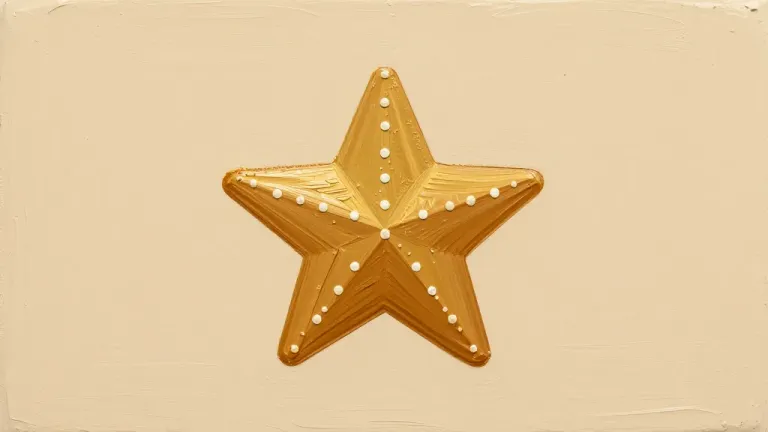 A glossy, golden star-shaped cookie emblem with white dots stands out against a creamy beige, textured background, illuminated by soft, diffused light that enhances its three-dimensional effect. The symmetrical composition and neutral backdrop make it ideal for branding and promotional materials.