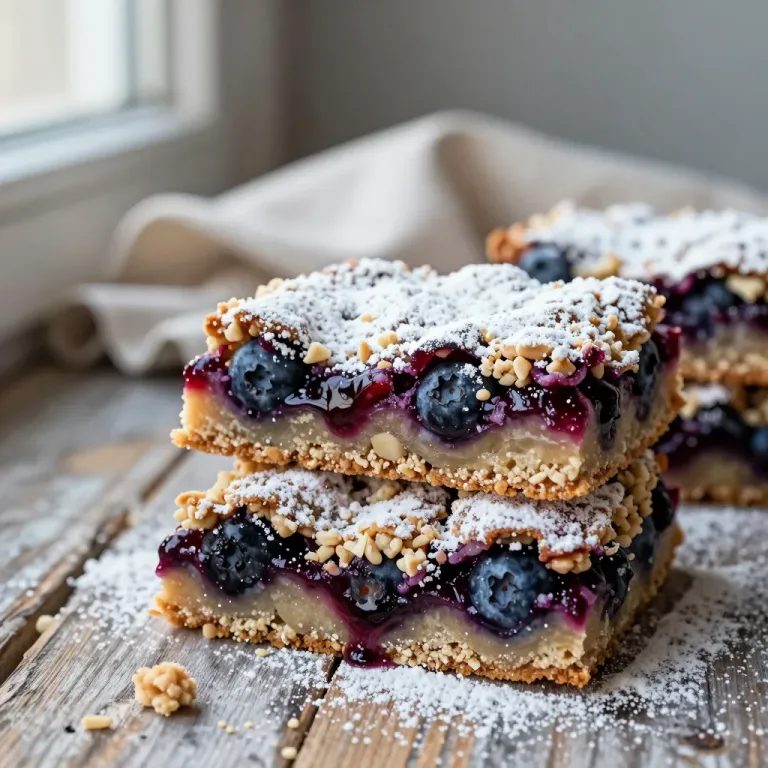 A pyramid of glossy blueberry crumble bars, dusted with powdered sugar, set against a soft natural light that highlights the textures and colors. The blurred wooden surface and light cloth in the background create a rustic and inviting atmosphere.