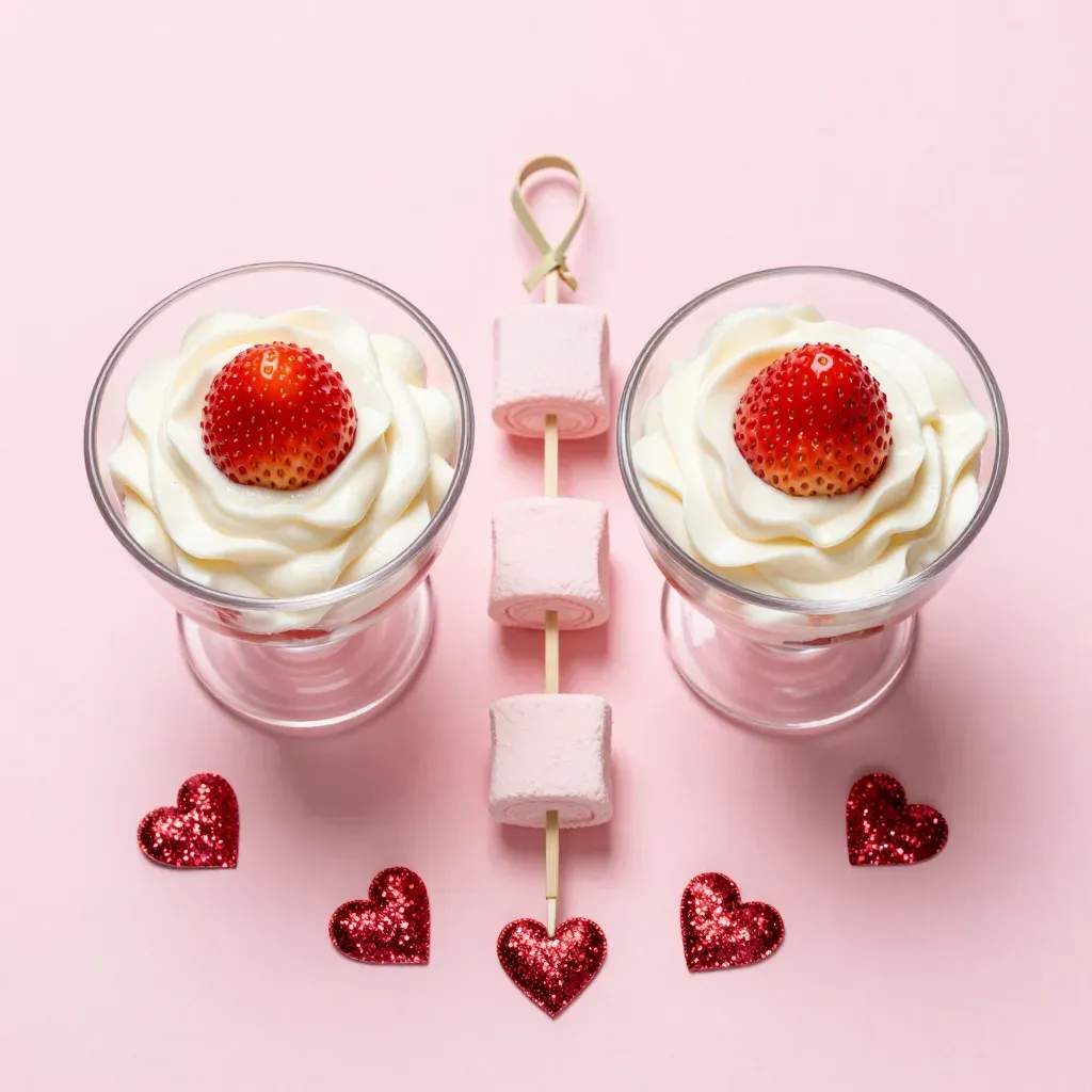 Two parfait glasses filled with whipped cream and topped with strawberries, set against a soft, diffused light that highlights the textures and colors of the parfait. The clean pink background with scattered red glitter hearts keeps the focus on the dessert, offering ample copy space for design elements.