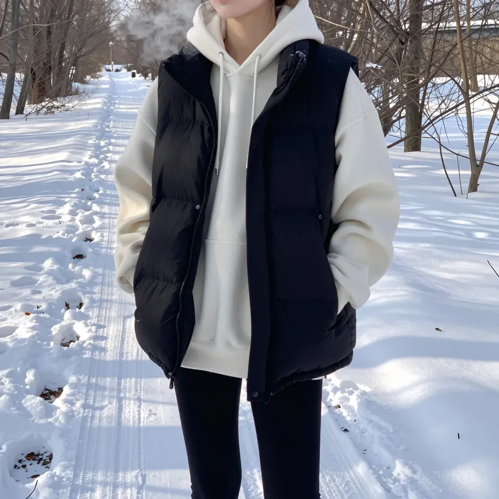 A person wearing a white hoodie and dark blue puffy vest stands on a snow-covered path, illuminated by soft, diffused light. The composition draws the eye down the path, emphasizing the serene, wintry landscape.