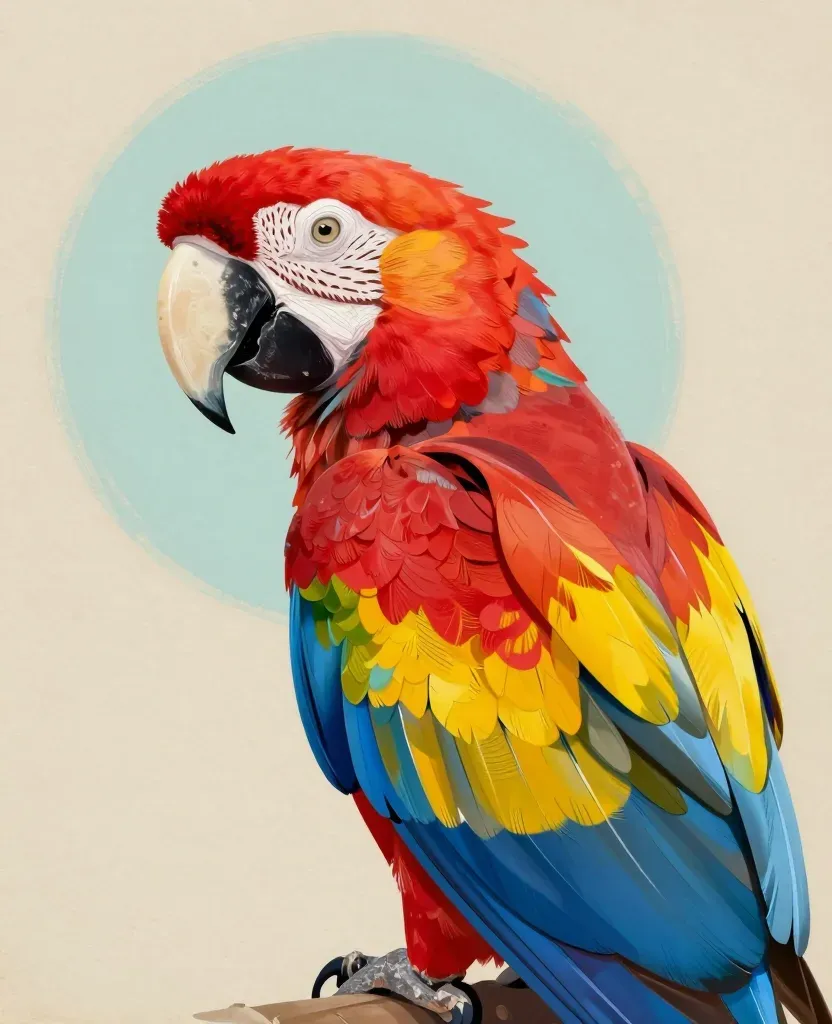 A vibrant Scarlet Macaw is depicted in a detailed close-up, showcasing its glossy feathers and robust beak under soft, diffused lighting. The shallow depth of field blurs the background, emphasizing the macaw's vivid colors and intricate textures.