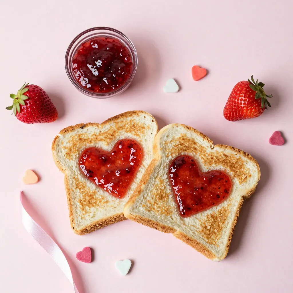 Toast slices are artfully arranged with heart-shaped jam, showcasing a glossy texture and vibrant red color. The soft, diffused lighting highlights the glossy jam and the golden brown toast, creating a visually appealing and symmetrical composition against a minimalistic pink background.