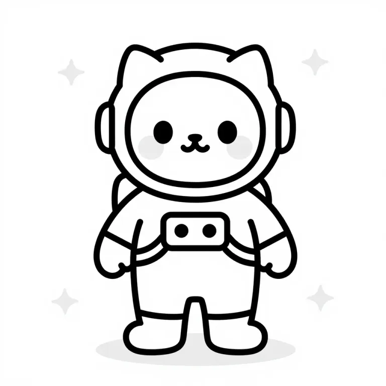 A stylized cat character in a simplified astronaut suit stands upright with rounded features and expressive eyes, rendered in clean black outlines on a white background. Soft front lighting and a subtle drop shadow beneath the feet enhance the 2D vector aesthetic, while minimal negative space and corner sparkles provide balanced composition.