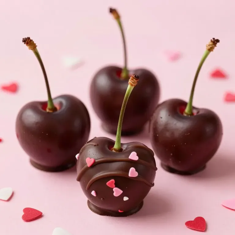 Four glossy chocolate-coated cherries are arranged in a cluster, one adorned with delicate pink and white heart sprinkles, showcasing a smooth, reflective chocolate surface over firm cherry skin. Soft diffused lighting creates gentle highlights and subtle shadows, with a shallow depth of field and scattered heart confetti on a pastel pink background enhancing visual focus on the foreground.