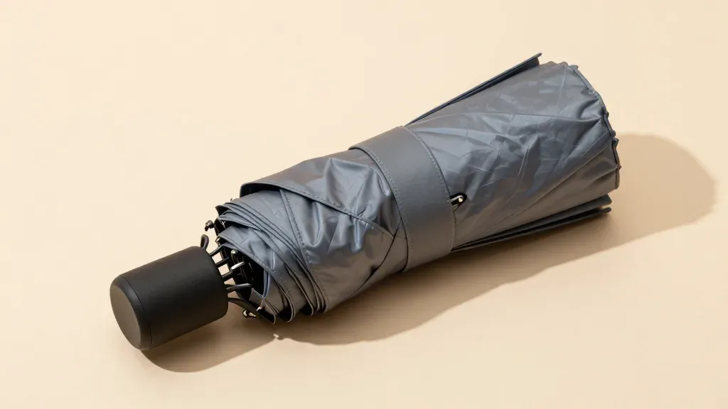 A compact umbrella, folded and lying flat, showcasing a smooth, glossy gray fabric with a slightly reflective surface. Soft, diffused lighting from above and slightly to the side creates subtle shadows, enhancing the texture and depth of the image.