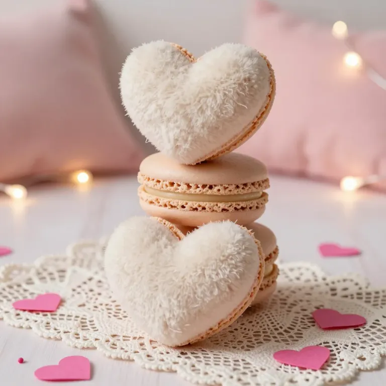 A pale pink macaron with a fluffy white heart pillow on top, set against a soft pink background with fairy lights, creating a cozy and romantic ambiance. The image features a shallow depth of field, focusing on the macaron and pillow with delicate lace doily and small pink heart confetti adding a playful touch.