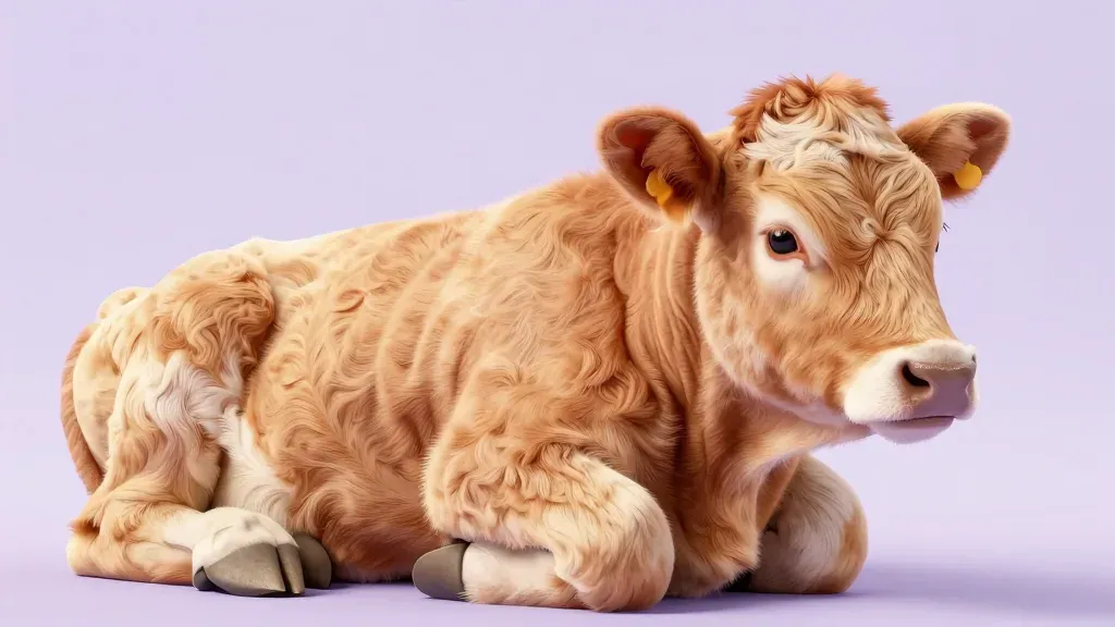 A soft, velvety apricot-colored calf rests peacefully on a smooth lavender surface, bathed in soft, diffused lighting that creates gentle shadows. The shallow depth of field and centered composition highlight the calf's serene posture against the blurred background.