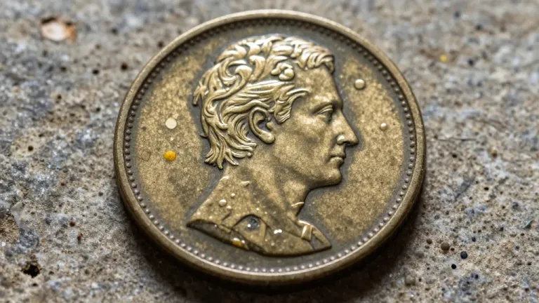 A close-up of an ancient bronze coin featuring a profile bust, its surface marked by greenish-brown patina and pitting, resting on a coarse, granular concrete background. Diffused natural light accentuates the raised relief details and creates soft highlights, while shallow depth of field isolates the coin from the blurred, textured backdrop.