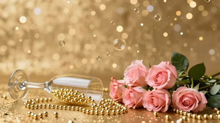 A bouquet of soft pink roses and glossy golden beads are arranged in the foreground, while champagne glasses filled with frothy bubbles are in the background, creating a luxurious and festive atmosphere. The warm, golden light highlights the glossy textures and reflective surfaces, adding depth and sparkle to the composition.