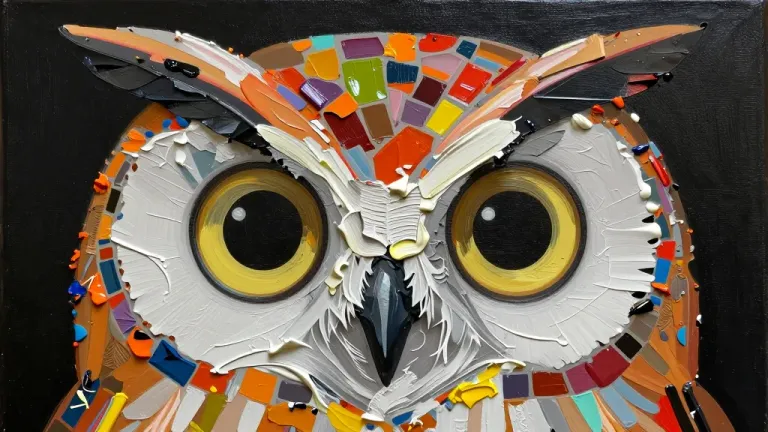 A close-up of a neon owl's face, rendered with thick, textured paint in vibrant neon colors, highlighting glossy areas and creating a three-dimensional effect. The black background isolates the subject, emphasizing the owl's striking features and the bold use of color.
