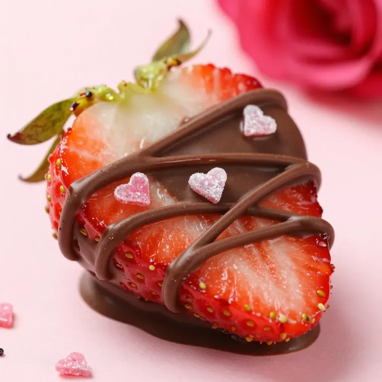 A halved strawberry slice is elegantly coated in glossy dark chocolate drizzle and adorned with translucent pink heart sprinkles, showcasing a juicy textured surface and vibrant red hue. Soft diffused lighting enhances the chocolate's sheen and creates subtle shadows, while a shallow depth of field isolates the subject against a blurred pink rose and pale pink surface.