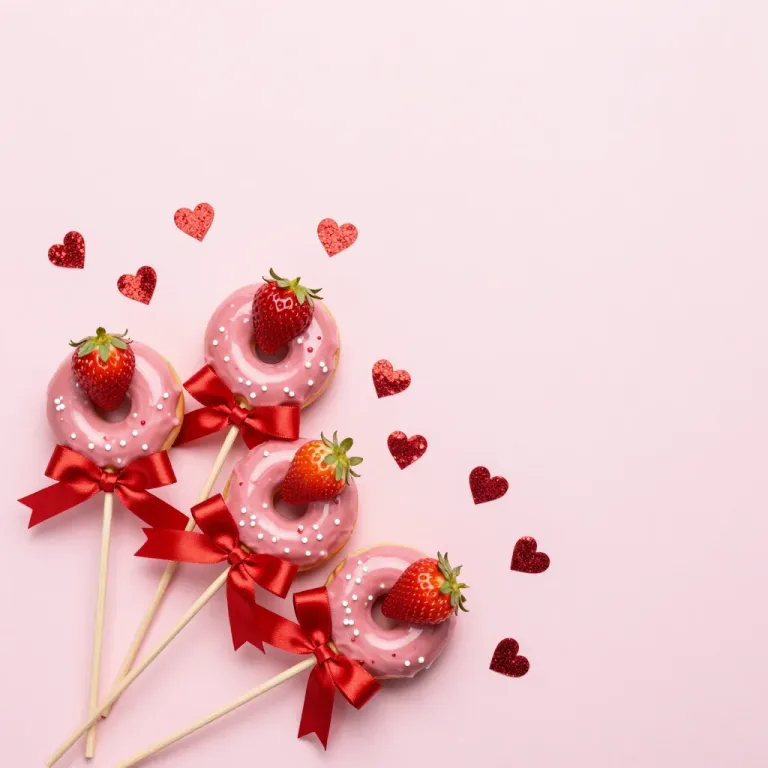 Fresh strawberry donuts with glossy pink glaze and vibrant red ribbons are arranged in a flat lay, creating a visually appealing and romantic display. The soft, diffused lighting highlights the glossy textures and enhances the warm, inviting atmosphere of the image, making it perfect for Valentine's Day or romantic themes.