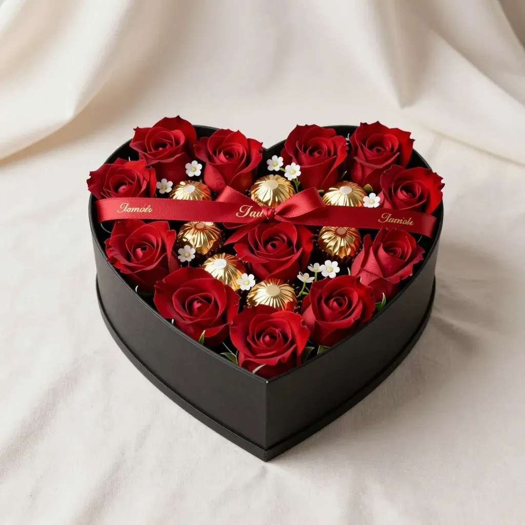 A heart-shaped box filled with glossy red roses and textured gold foil chocolates, arranged symmetrically under soft, diffused lighting. The plain white fabric background enhances the subject's prominence, offering ample copy space for design purposes.