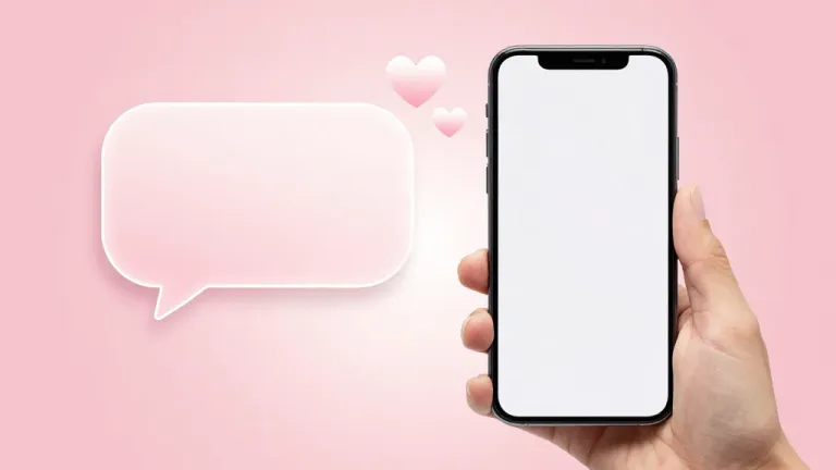 A hand holds a smartphone with a clean pink background and soft lighting, creating a minimalist and modern aesthetic. The composition includes a speech bubble and hearts, adding a playful and social media-like feel.