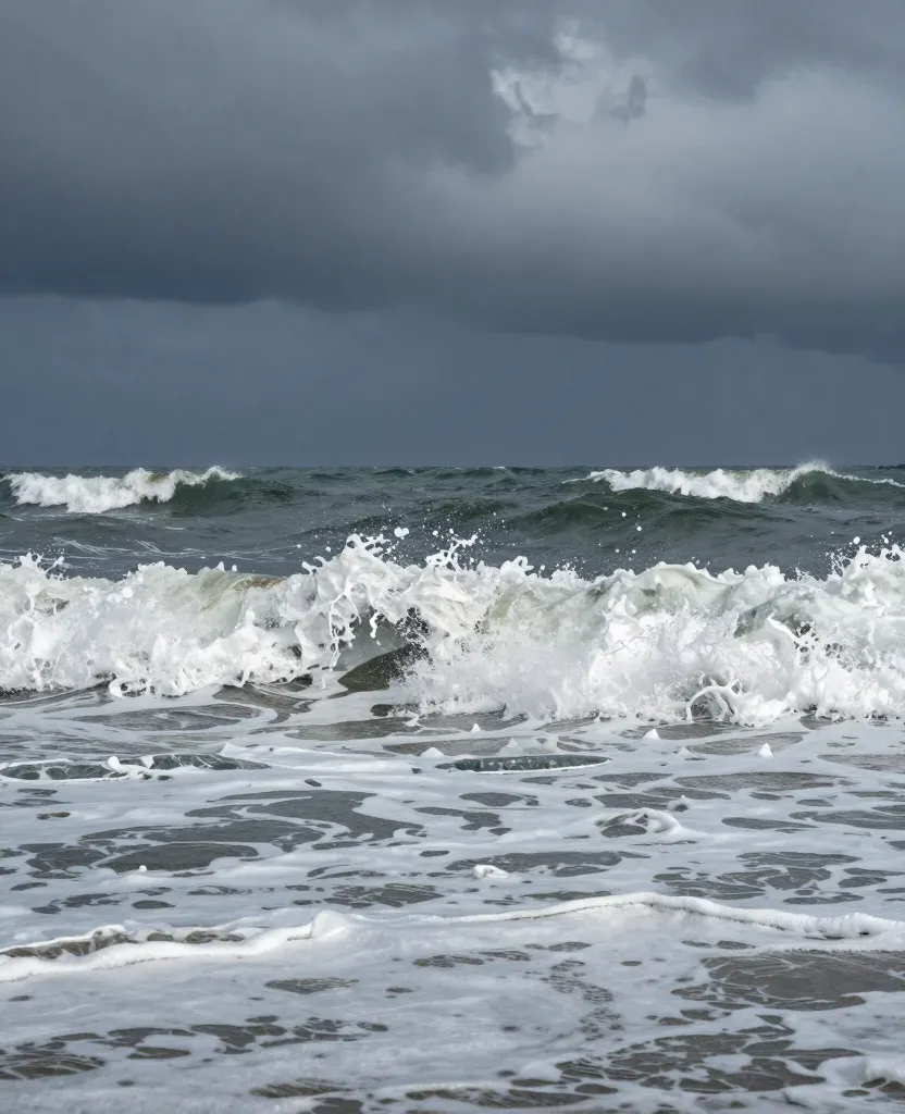 Rough, airy foam from crashing waves contrasts with dark, churning water under an overcast sky, creating a dramatic and textured seascape. The diffuse lighting and deep composition make this image ideal for design elements requiring a moody, natural backdrop.
